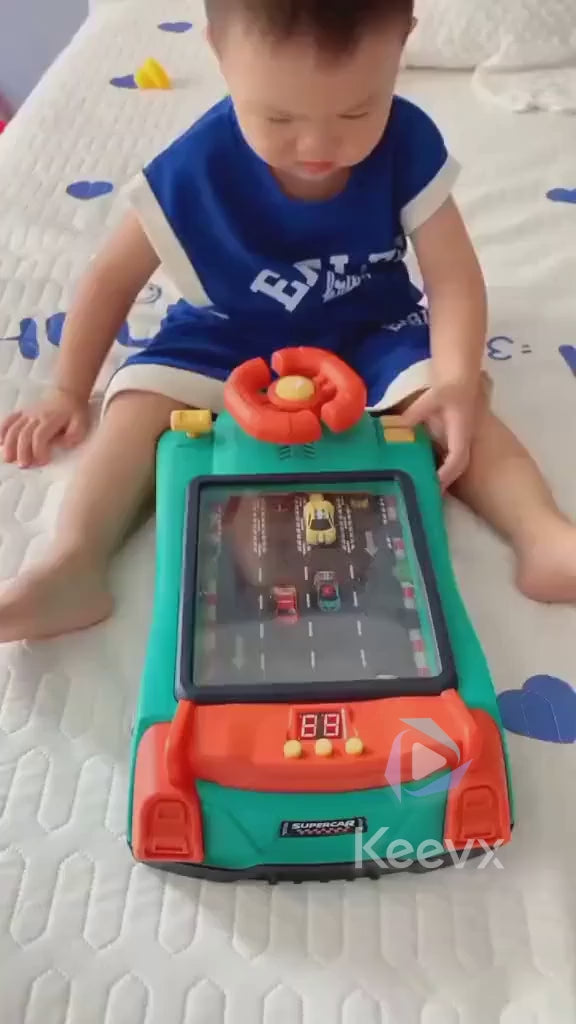 A fun and educational handheld driving game with steering wheel and moving racing cars – perfect for imaginative play and hand-eye coordination development.